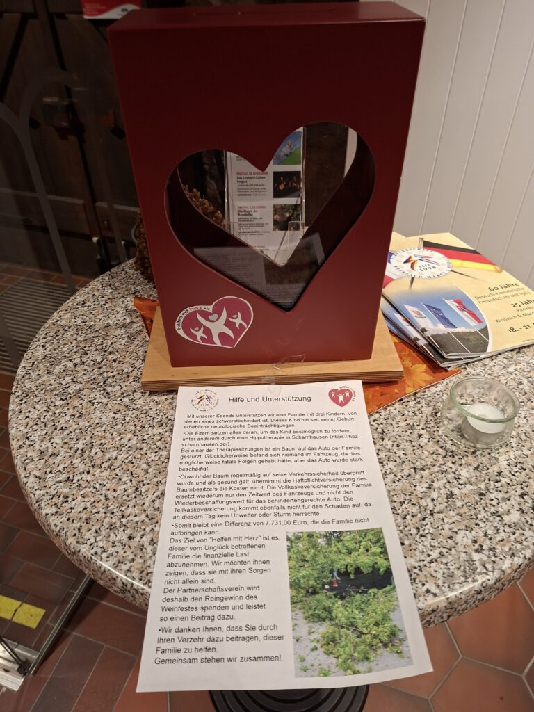 Der Reingewinn des Festes wurde als Spende für ein Projekt von Helfen mit Herz weitergegeben. Dieser Verein unterstützt eine Familie, die durch eine bedauerliche Folge von Ereignissen in akute Not geraten ist. Die Spende soll gezielt dazu beitragen, den Betroffenen in dieser schwierigen Situation beizustehen.
