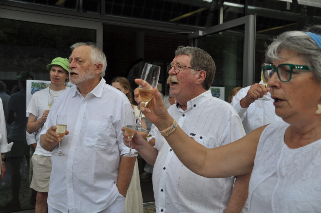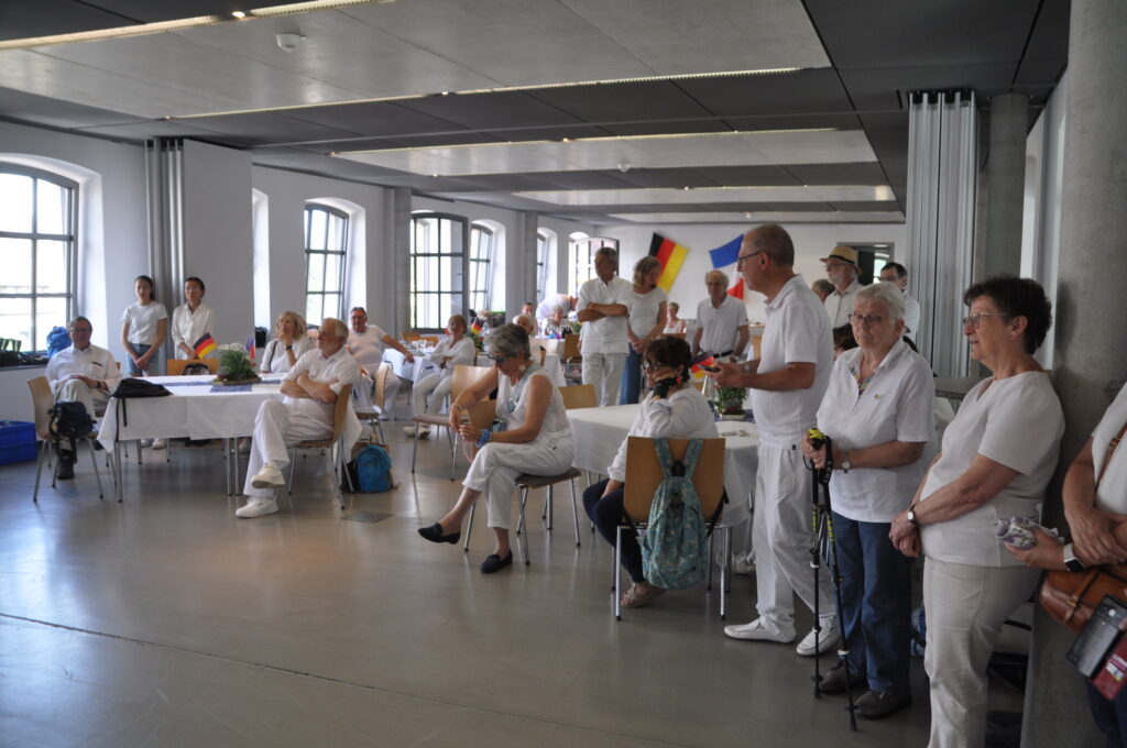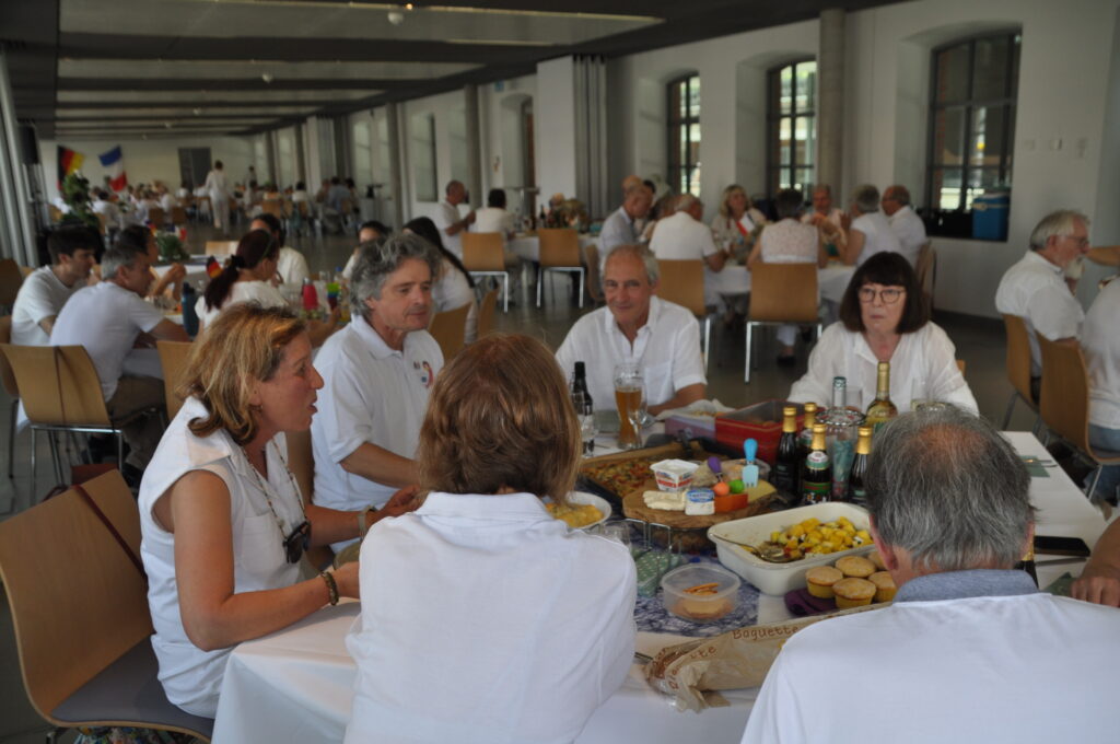 Traditionell klingt ein Partnerschaftswochenende mit dem Dîner en blanc am Sonntagmittag aus. Gäste und Gastgeber erschienen in Weiß gekleidet und die Gastgeber brachten aus Ihren Küchen und Kellern Getränke und leckeres Essen mit. Wir hatten zwar die Möglichkeit, Sitzgelegenheit und Tische im Freien unter der Überdachung der Parkplätze einzurichten. Jedoch erwies sich das Wetter nicht stabil genug und es gab auch Regenschauern. Wir hatten das Glück, dass wir in der Strickfabrik den bereits weiß eingedeckten Saal für dieses Dîner en blanc nutzen konnten. Alle nahmen an bereitgestellten Tischen und Stühlen Platz. Die Gäste tauschten sich über das Wochenende und ihre Freundschaft aus.